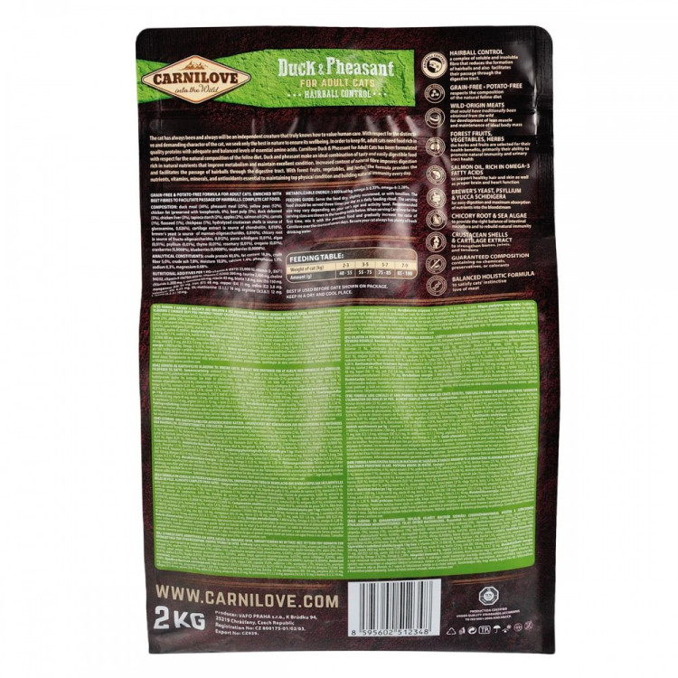 Carnilove Cat Duck & Pheasant Hairball Control - это высококачественный сухой корм для кошек, специально разработанный для поддержания здоровья шерсти и предотвращения образования комков шерсти в пищеварительной системе вашего кота. Содержащаяся в корме утка и фазан являются натуральными источниками высококачественного животного белка, что способствует поддержанию мышечной массы и общего вида животного.