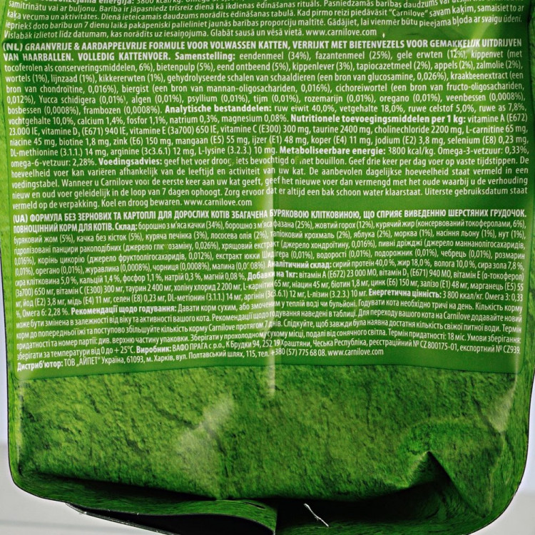 Carnilove Cat Duck & Pheasant Hairball Control - это не только вкусное и питательное питание для вашей кошки, но и эффективное решение для поддержания ее общего здоровья и комфорта. Он создан с учетом природных потребностей кошек и обеспечивает балансированное питание, способствующее здоровой жизни вашего питомца.