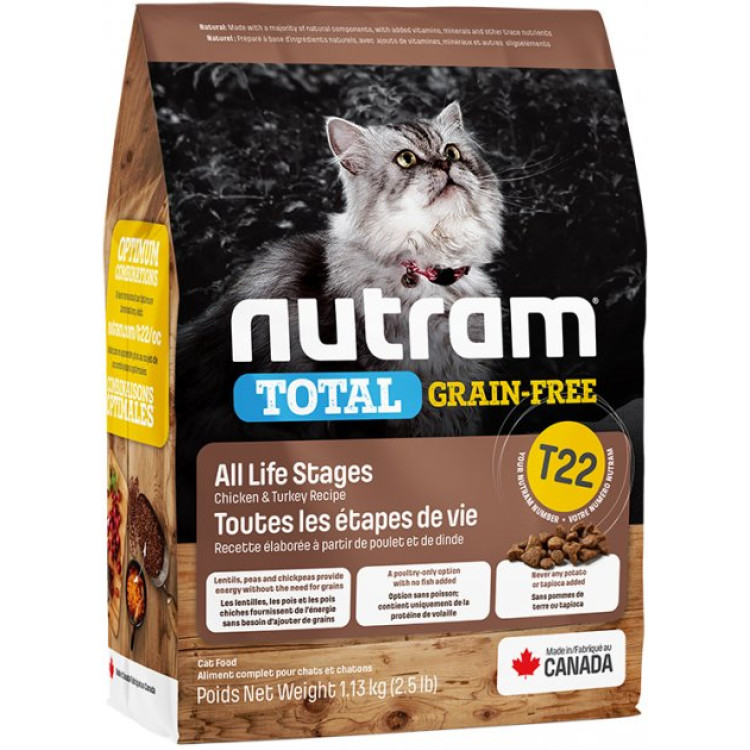 Nutram T22 Turkey & Chicken - это высококачественный беззерновой сухой корм, специально разработанный для котов. Основные ингредиенты этого корма - натуральное мясо индейки и курицы, богатые превосходными белками, необходимыми для поддержания здоровья мышц и общего благополучия.