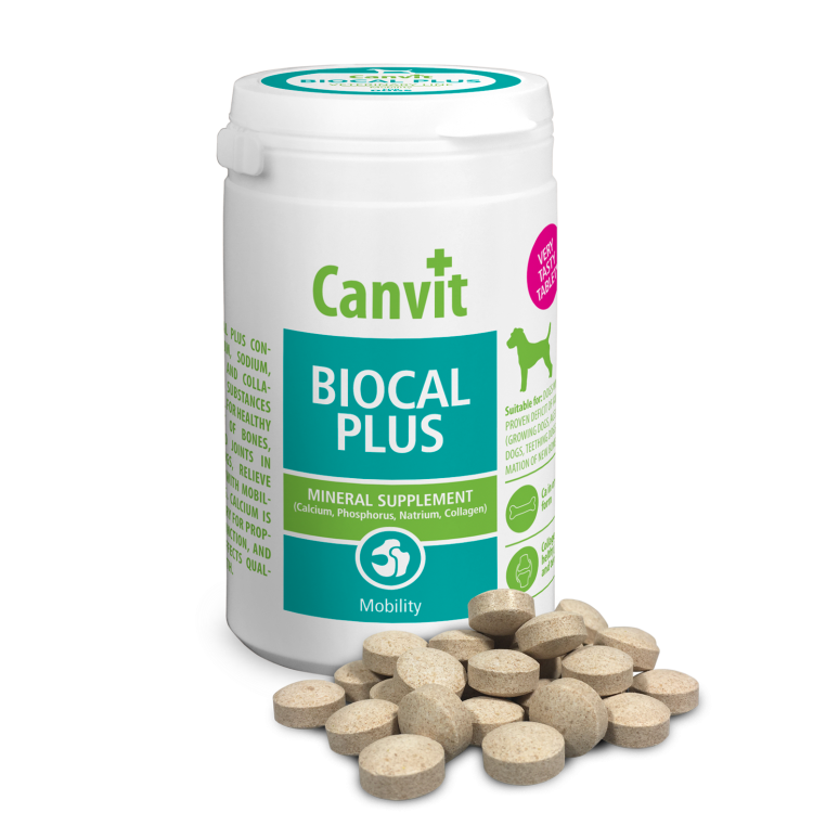Canvit Biocal+ применяется в случаях дефицита минералов (рост, прорезывание зубов, старые собаки) и для формирования костей после переломов. BioCal Plus предназначен для обеспечения организма собаки кальцием, фосфором, натрием и желатином, которых часто не хватает в период несбалансированного питания и повышенной потребности. в микроэлементах. Указанные минеральные элементы и желатин в легкодоступной форме необходимы для здорового развития костной ткани, сухожилий, суставов, хрящей, зубов и мышц.