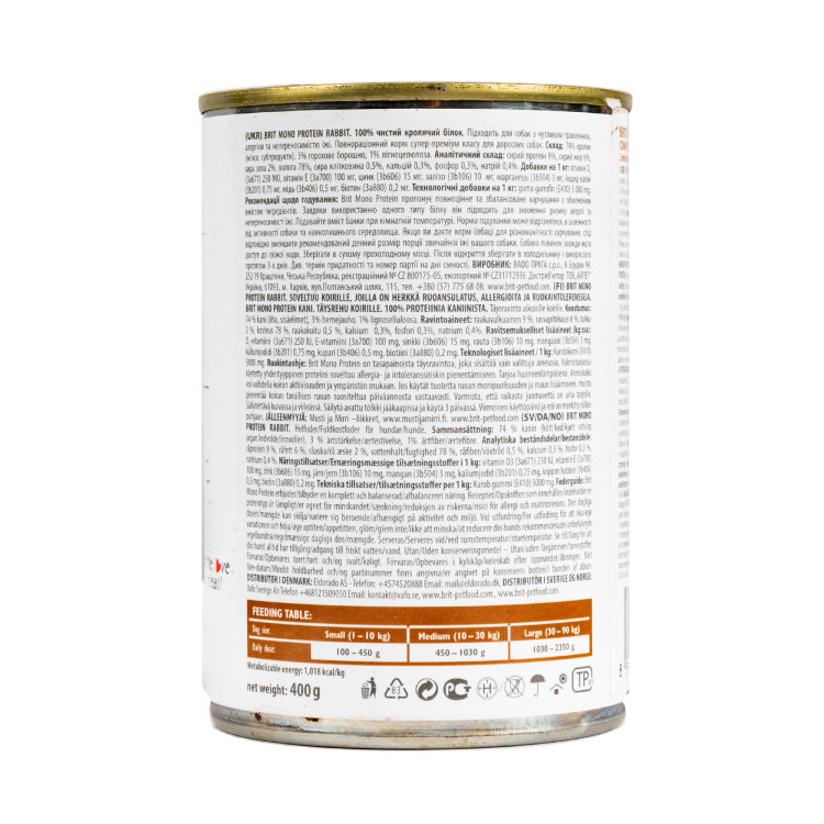 Brit Mono Protein Rabbit - высококачественные консервы для собак всех пород, созданные на основе кролика. Этот продукт предоставляет вашему питомцу вкусное и сбалансированное питание. Кролик, являясь единственным источником белка в составе, поддерживает мышечную массу и обеспечивает легкую усвояемость.