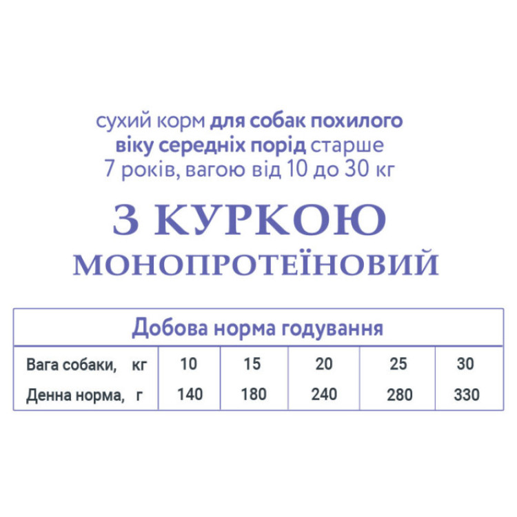 Этот корм рекомендуется для пожилых собак старше 7 лет или для взрослых малоактивных питомцев.