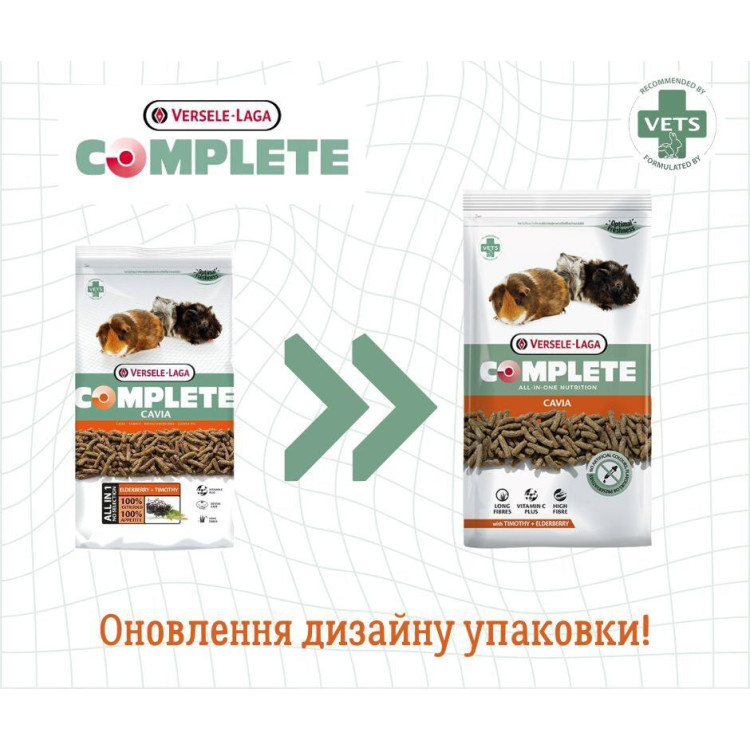 Основу Versele-Laga Complete Cavia складають легкозасвоювані волокна, що сприяють здоровій травній системі та підтримує оптимальну вагу морських свинок. Крім того, корм збагачений вітаміном C, який є особливо важливим для морських свинок, оскільки вони не можуть синтезувати цей вітамін самостійно.