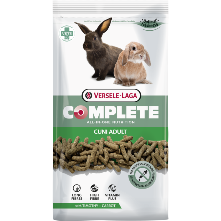 Versele-Laga Complete Cuni Adult також містить клітковину, яка сприяє здоровій роботі кишечника та запобігає проблемам зі шлунком у кроликів. Цей корм сприяє зміцненню зубів кролика та запобіганню зайвого утворення зубної емалі.