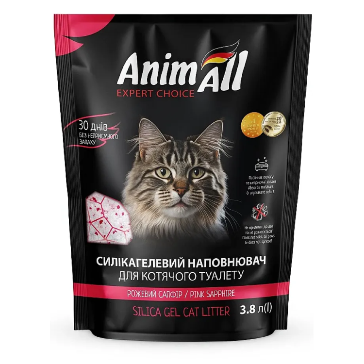 Силікагель ТМ AnimAll — це висушений гель полікремнієвої кислоти (SiO2), який хімічно складається з того ж з\'єднання, що і звичайний пісок, але є високопористим тілом, тому має величезну площу поверхні (800 м²/1 г). Завдяки цій властивості силікагель має унікальну абсорбуючу (вбирає) здатність. Волога і запах зникають в силікагелі AnimAll миттєво, але сам наповнювач ніколи не перетворюється на в\'язку масу і не прилипає до котячих лап, а значить, не розноситься по дому. Силікагель AnimAll прекрасно висушений, що можна визначити по прозорості його кристалів. Це дозволяє йому вбирати максимальну кількість рідини. Переваги використання наповнювача: гігієнічність; природний абсорбент (цей наповнювач на 98 % складається з кварцового піску, що робить його абсолютно екологічним і нешкідливим); високе поглинання; відсутність неприємного запаху й бактерій (за лічені секунди припиняє ріст бактерій, робить повітря чистим і свіжим); рівень pH = 8-9 (цей рівень сприяє вирішенню проблем, пов’язаних із запахом, за рахунок гальмування процесу розкладання сечовини в амоній); відсутність пилу; не прилипає до лап і шерсті; з додаванням кольорових гранул.
