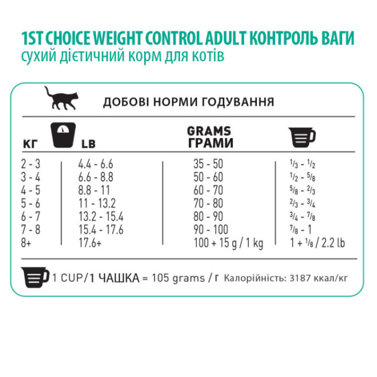 1st Choice Weight Control Adult – це сухий корм, розроблений спеціально для кішок, схильних до повноти. Цей корм надає ефективне рішення для контролю ваги вашої кішки, допомагаючи їй досягти та підтримувати оптимальну фізичну форму.