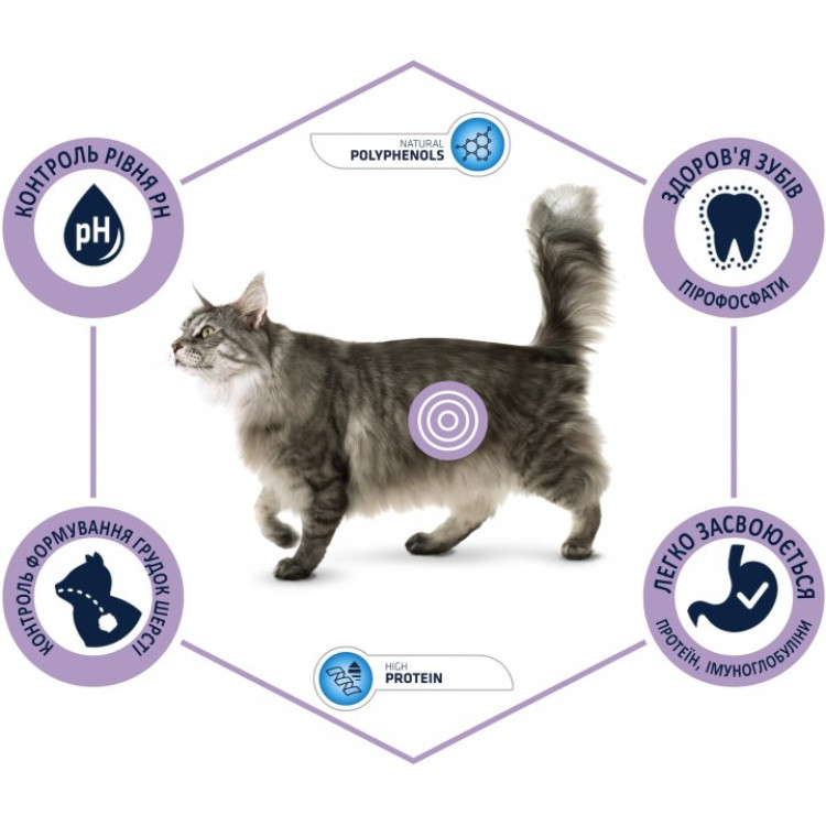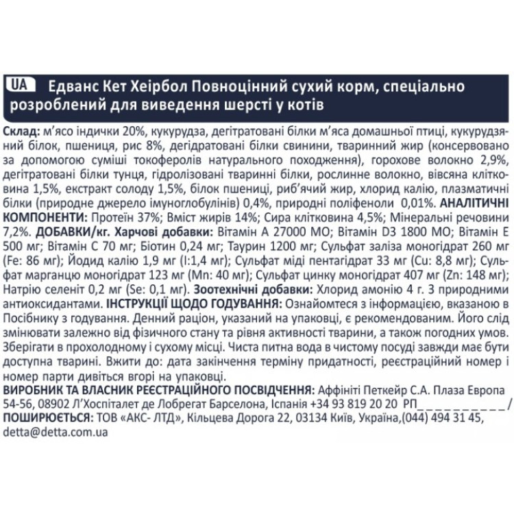 Advance Cat Hairball допомагає знизити ризик утворення грудок вовни, що особливо актуально для довгошерстих і линяючих кішок. Цей корм сприяє природному виведенню вовни та підтримує здоров`я шлунково-кишкової системи.