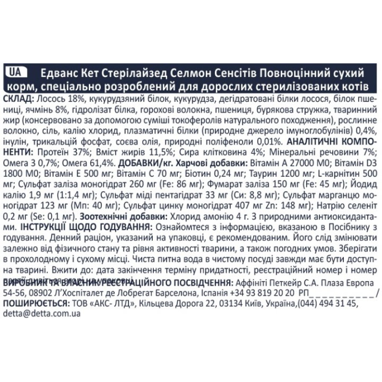 Advance Cat Steril Sensitive Salmon – це ідеальний вибір для стерилізованих кішок з чутливим травленням. Він забезпечує поживність та підтримку, необхідні для здоров`я та комфорту вашої пухнастої подруги. Без штучних добавок та ГМО, цей корм створений для тривалого благополуччя вашої кішки.