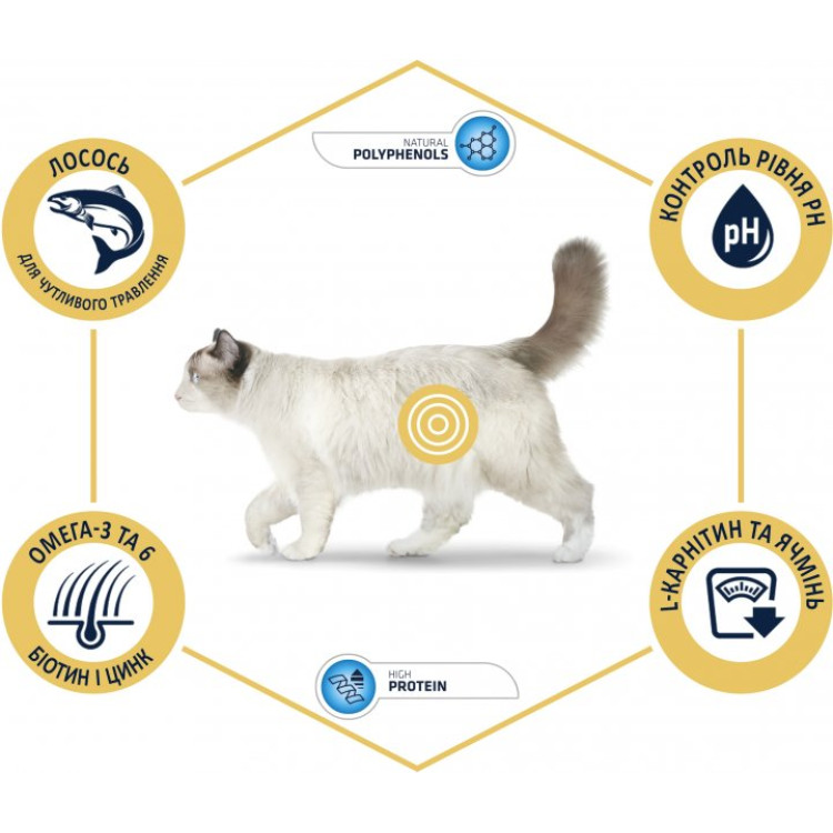 Головним компонентом корму є свіжий лосось, який є джерелом високоякісного білка та омега-3 жирних кислот. Омега-3 підтримує здоров`я шкіри та вовни, а також сприяє зміцненню імунної системи. Лосось також збагачує корм смаком, що дозволяє задовольнити навіть найвибагливіших кішок.