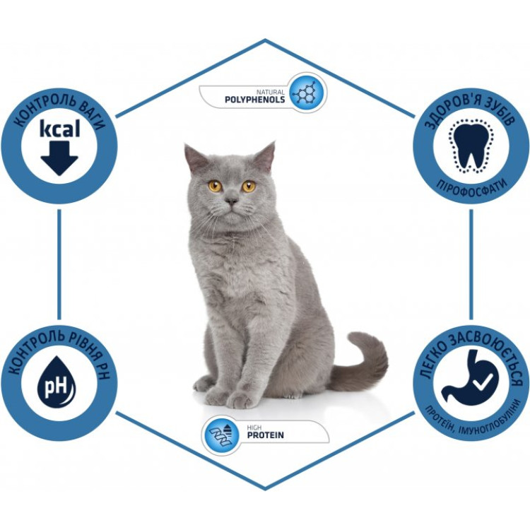 Корм збагачений важливими вітамінами та мінералами, що підтримують імунітет та загальне здоров`я кішки. Омега-6 жирні кислоти підтримують здоров`я шкіри та хутра, надаючи вовни м`якість та блиск.