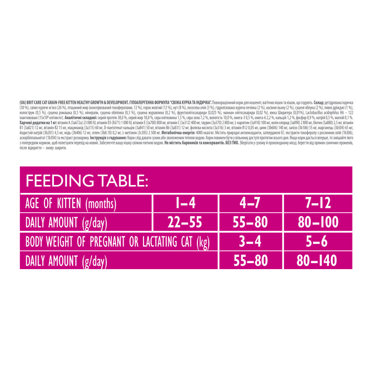 Важливо відзначити, що корм Brit Care Kitten HGrowth & Development не містить зерна, що робить його легкозасвоюваним і придатним для чутливих травних систем кошенят. Додатково корм збагачений таурином - амінокислотою, яка важлива для здоров\'я серця і зору у кошенят. Care Kitten HGrowth & Development - ідеальний вибір для забезпечення здорового росту та розвитку вашого вихованця. Правильне харчування в цей період життя дозволить йому стати сильним і активним дорослим котом.