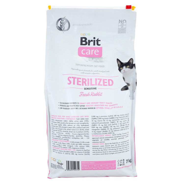 Brit Care Sterilized Sensitive - це супер-преміум класу сухого беззернового корму, спеціально розробленого для стерилізованих кішок з чутливим шлунково-кишковим трактом (ЖКТ).