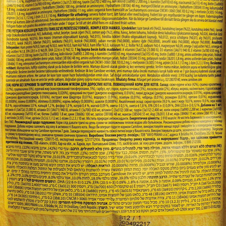 Зберігання: зберігати при температурі від 0 до +25 °С та відносної вологості повітря не більше 80%. Після відкриття пакет із кормом необхідно щільно закривати.