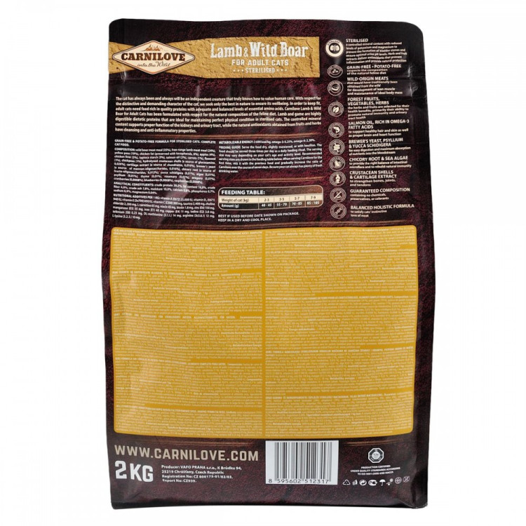Carnilove Cat Lamb & Wild Boar Sterilised - це сухий корм спеціально розроблений для стерилізованих кішок, щоб забезпечити їм здорове і збалансоване харчування. Головними інгредієнтами цього корму є натуральні ягня та кабан, що надають високоякісне джерело білка для підтримки м`язової маси та загального добробуту кішок після стерилізації.