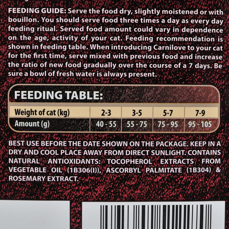 Зберігання: зберігати при температурі від 0 до +250С та відносній вологості повітря не більше 80%. Після розтину пакет із кормом необхідно щільно закривати.