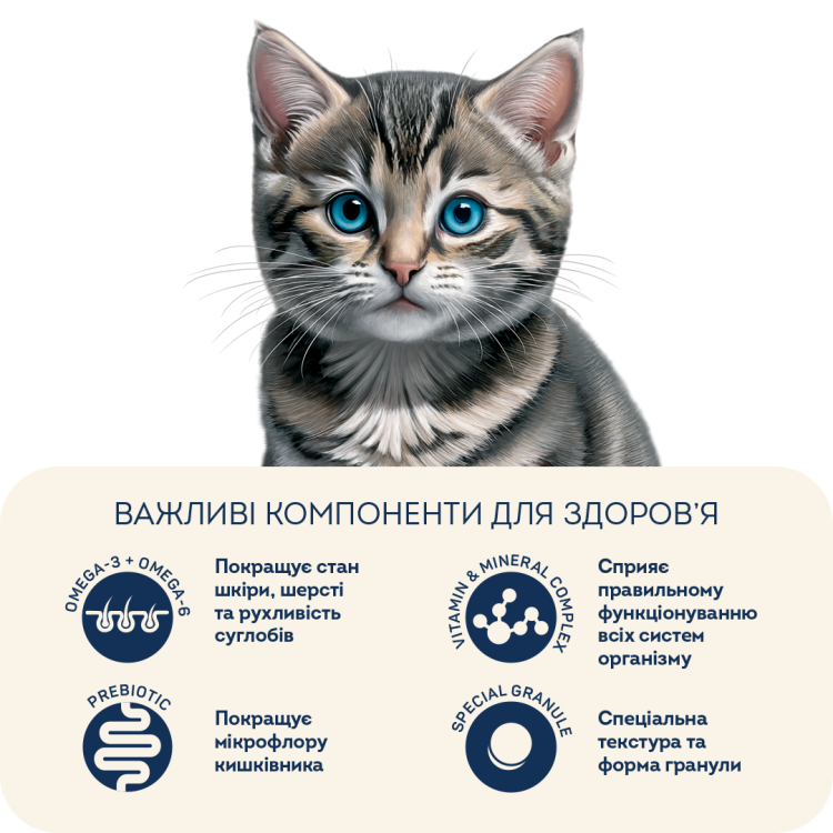 Свіже м\'ясо курки забезпечує організм кошеняти цінними легкозасвоюваними білками, які дарують енергію на цілий день, сприяють правильному та поступовому росту і розвитку малечі.