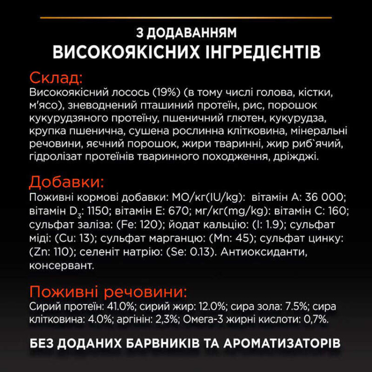 Основний компонент - натуральний лосось, що надає високоякісний білок, важливий для підтримки м`язової маси та загальної активності кішки. Це особливо важливо для стерилізованих кішок, які можуть мати схильність до надмірної ваги.