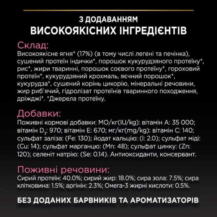 Purina Pro Plan DeliCate Lamb є чудовим поєднанням якісних інгредієнтів та наукових досліджень, створене для котів з чутливим шлунком, щоб забезпечити їм комфортне травлення та оптимальне благополуччя.