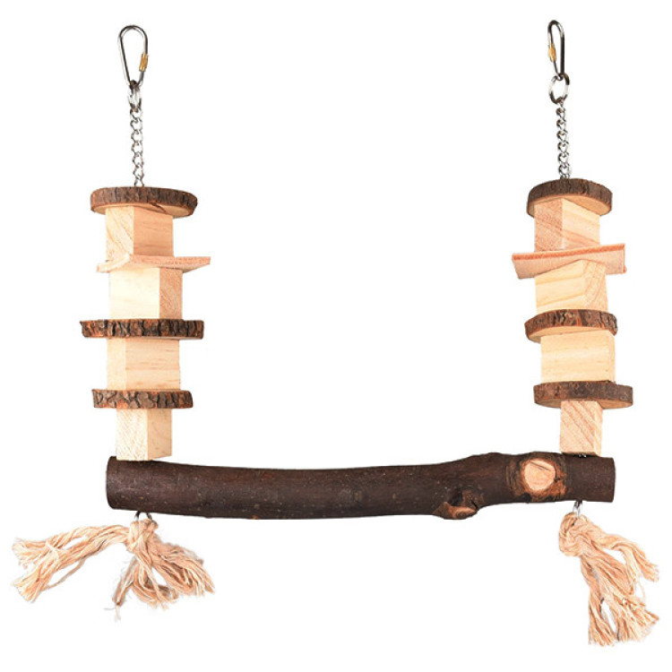 Жердинка гойдалки для папуг підвішується за допомогою металевої ланцюжка з нероз`ємними ланками і металевих карабінів. На ланцюжок нанизані з обох боків дерев`яні елементи різної геометричної форми, а також пара шматочків натуральної нефарбованої шкіри. Елементи вільно переміщаються уздовж ланцюжка і обертаються. Ваш папуга буде в захваті від можливості досліджувати текстури, клювати, точити дзьоб, рухати і обертати елементи.
