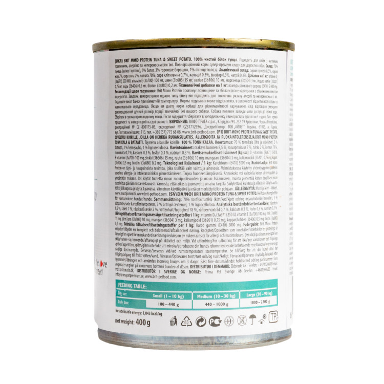 Brit Mono Protein Tuna & Sweet Potato – високоякісні консерви для собак усіх порід з тунцем та бататом. Цей продукт забезпечує вашого вихованця смачним та збалансованим харчуванням. Тунець, будучи єдиним джерелом білка в кормі, підтримує м\'язову масу та забезпечує легку засвоюваність.