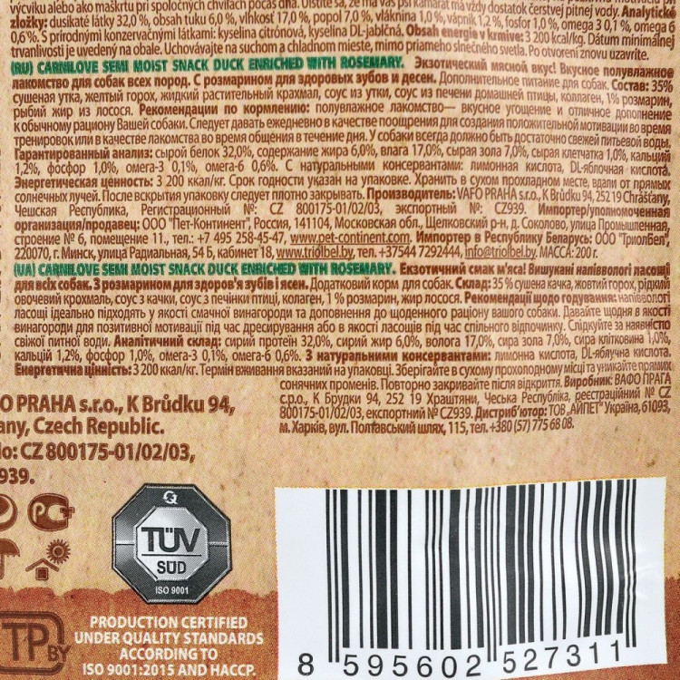 Ласощі містять високоякісне м`ясо качки, багате на білок і важливі поживні речовини для підтримки активності та здоров`я собаки. Розмарин, відомий своїми антиоксидантними властивостями, збагачує ласощі, сприяючи загальному добробуту.