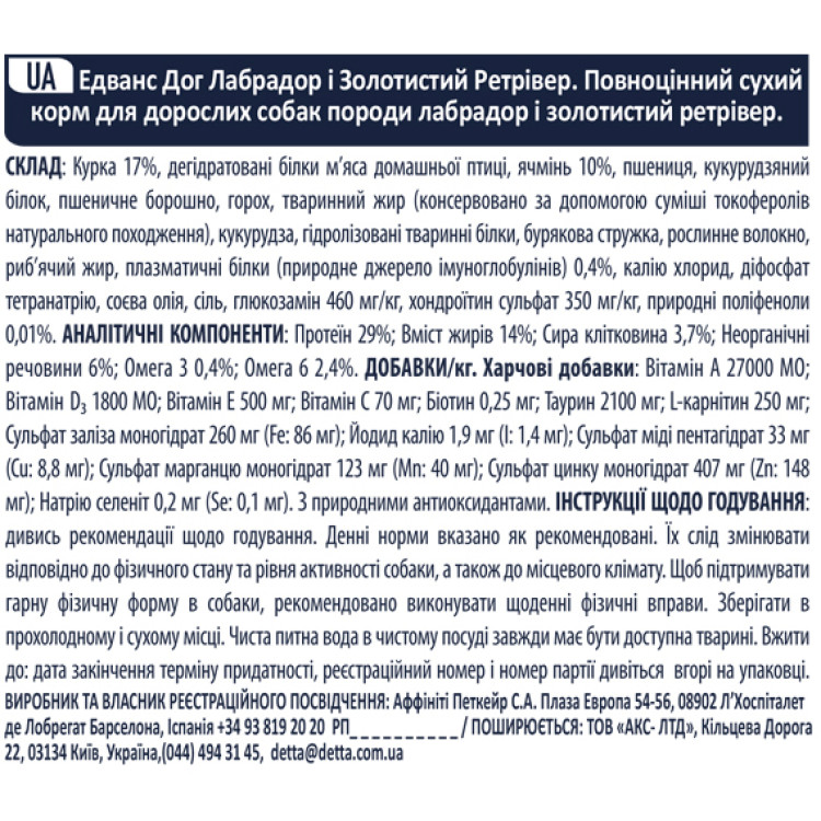 Advance Dog Labrador Golden Retriever Chicken - це високоякісний сухий корм спеціально розроблений для лабрадорів і голден ретріверів з натуральною куркою. Цей корм враховує унікальні потреби та особливості цих порід, забезпечуючи повноцінне та збалансоване харчування.