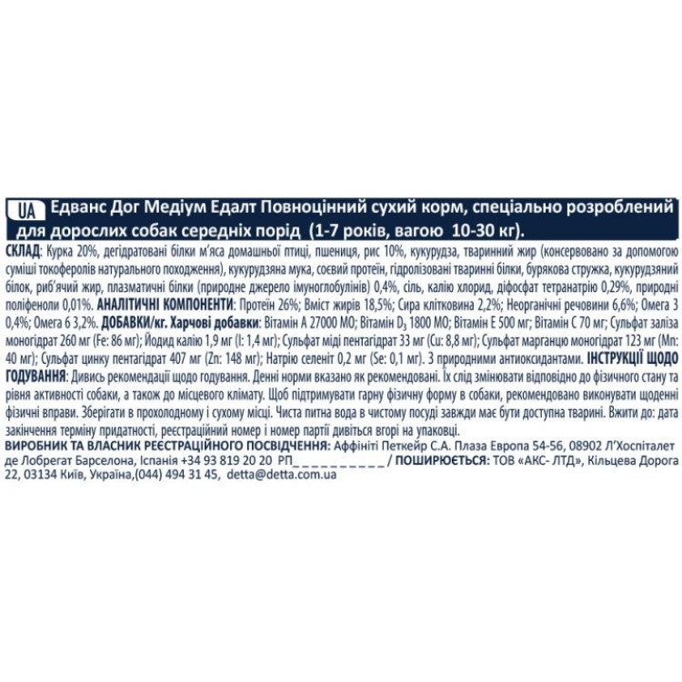 Advance Dog Medium Adult Chicken & Rice розроблено з урахуванням потреб дорослих собак середніх порід, надаючи їм апетитний смак курки. Спеціальна форма та розмір гранул полегшують прийом їжі та травлення.