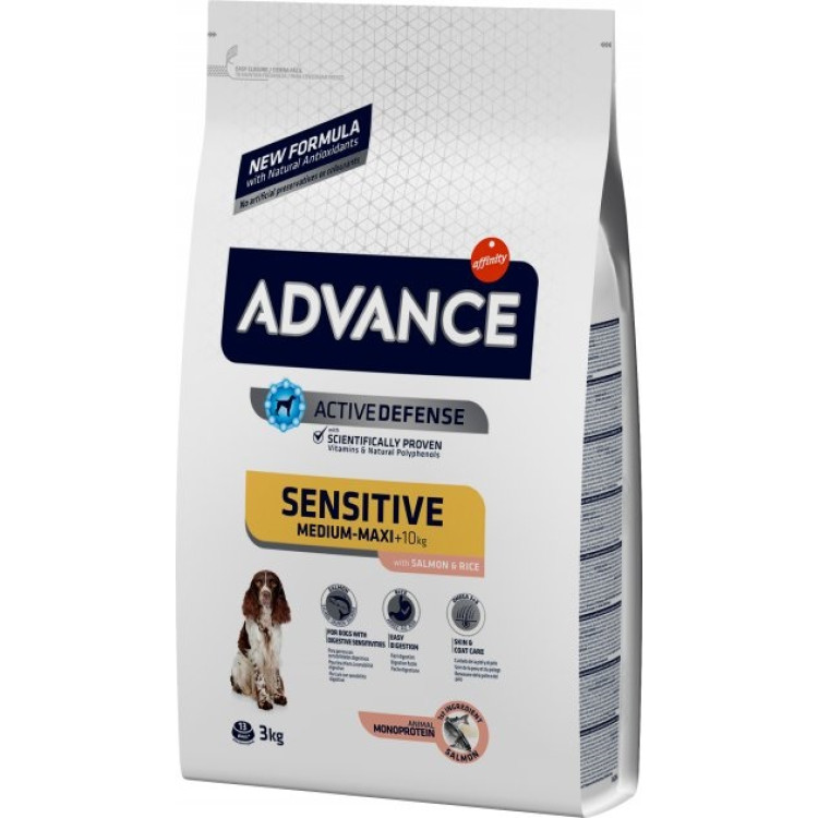 Advance Dog Medium Maxi Sensitive Salmon Rice розроблений з урахуванням чутливості травлення, надаючи легкозасвоюване харчування. Спеціальна форма та розмір гранул полегшують прийом їжі та травлення.