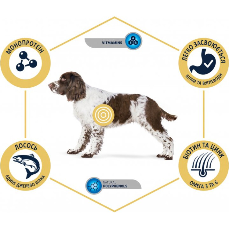Спеціалізовані компоненти у складі корму сприяють здоров`ю шкіри та шерсті, підтримують нормальне функціонування травної системи та збагачують організм собаки важливими жирними кислотами, які також можуть сприяти зменшенню запалень.