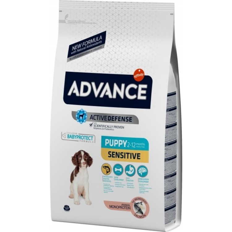 Advance Dog Puppy Sensitive Salmon Rice розроблений з урахуванням чутливості травлення, надаючи харчування, що легко засвоюється. Спеціальна форма та розмір гранул полегшують прийом їжі та травлення.
