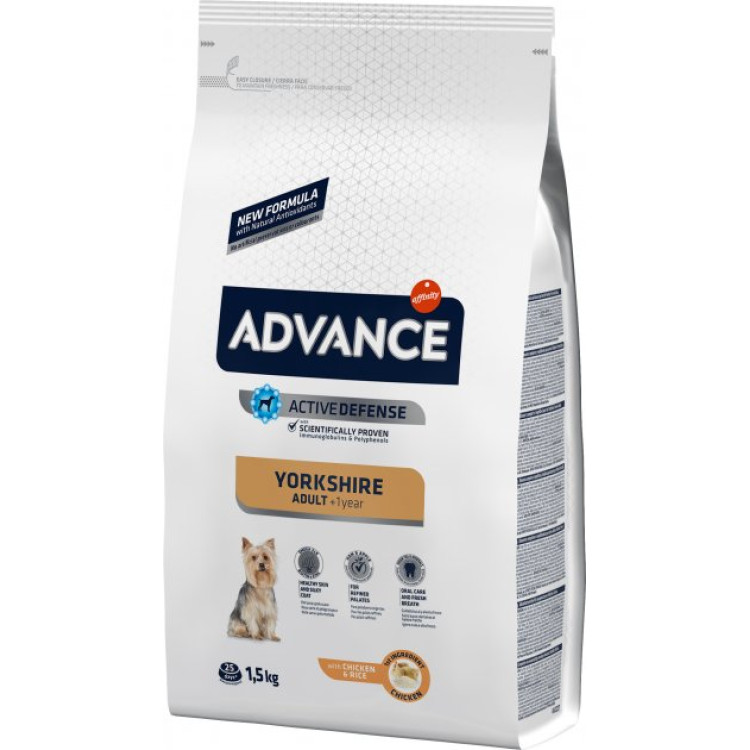 З урахуванням потреб йоркширських тер`єрів, Advance Dog Yorkshire надає апетитний смак курки. Спеціальна форма та розмір гранул полегшують прийом їжі та травлення, що особливо важливо для цієї дрібної породи.