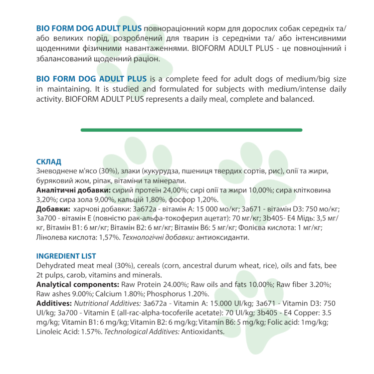 Bio Form Dog Adult Plus - це не тільки поживна страва, але і смачні ласощі для вашого собаки. Цей корм підтримує її активність, здоров`я та радість, роблячи щодня повним здоров`я та радості життя.