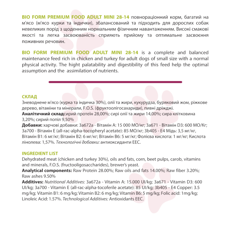 Bio Form Premium Food Adult Mini Chicken & Turkey - це не тільки поживна, але й смачна страва, яка припаде до смаку навіть найвибагливішим собакам дрібних порід. Цей корм підтримує їхнє здоров`я та радість, забезпечуючи ідеальне харчування для активного та щасливого життя.