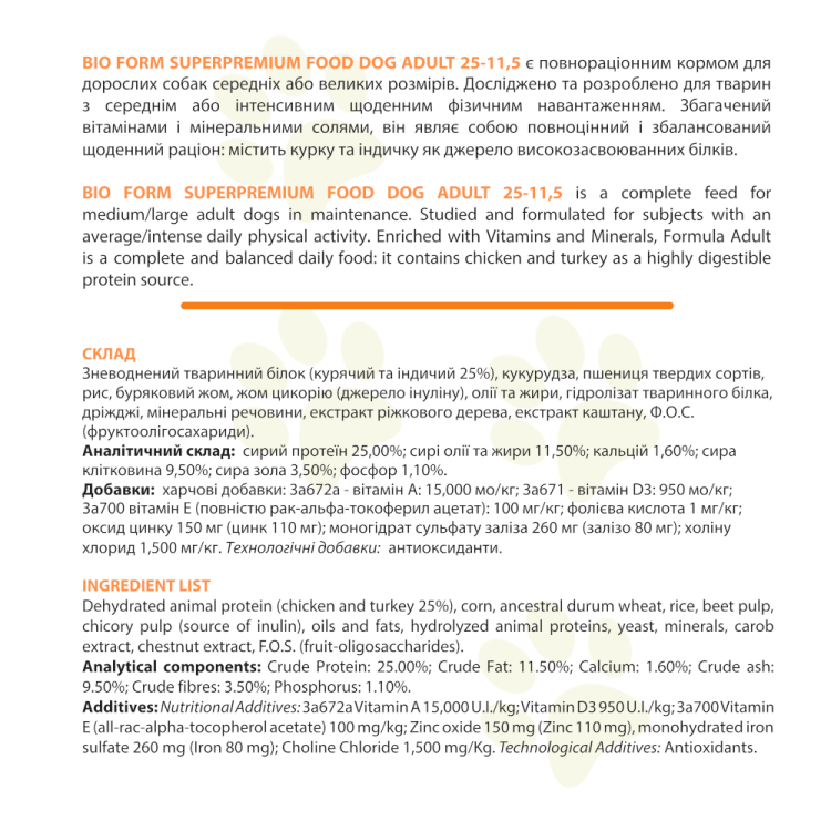 Bio Form Super Premium Food Dog Adult 25/10 – це високоякісний сухий корм, розроблений спеціально для собак середніх та великих порід. Основні інгредієнти корму - натуральна курка та індичка, збагачені високоякісними білками та поживними речовинами, необхідними для підтримки здоров`я та енергії вашого вихованця.