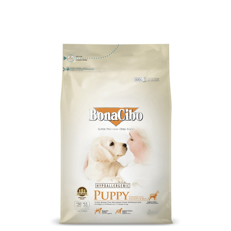 BonaCibo Puppy Chicken & Rice with Anchovy - це високоякісний корм супер-преміум класу спеціально розроблений для цуценят, вагітних/годуючих собак усіх порід. Він пропонує смачне поєднання курки, рису та анчоусів для здорового та повноцінного харчування.