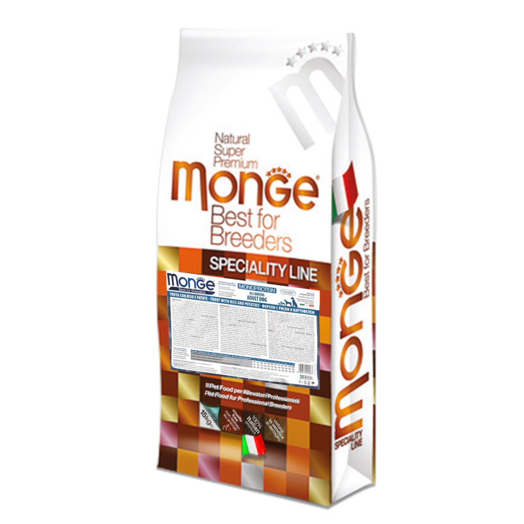 Monge Monoprotein All breeds Adult Trout - високоякісний сухий корм для дорослих собак усіх порід із фореллю, рисом та картоплею. Форель, будучи основним джерелом білка, забезпечує збалансований і легкозасвоюваний раціон, необхідний підтримки м`язової маси і здоров`я.