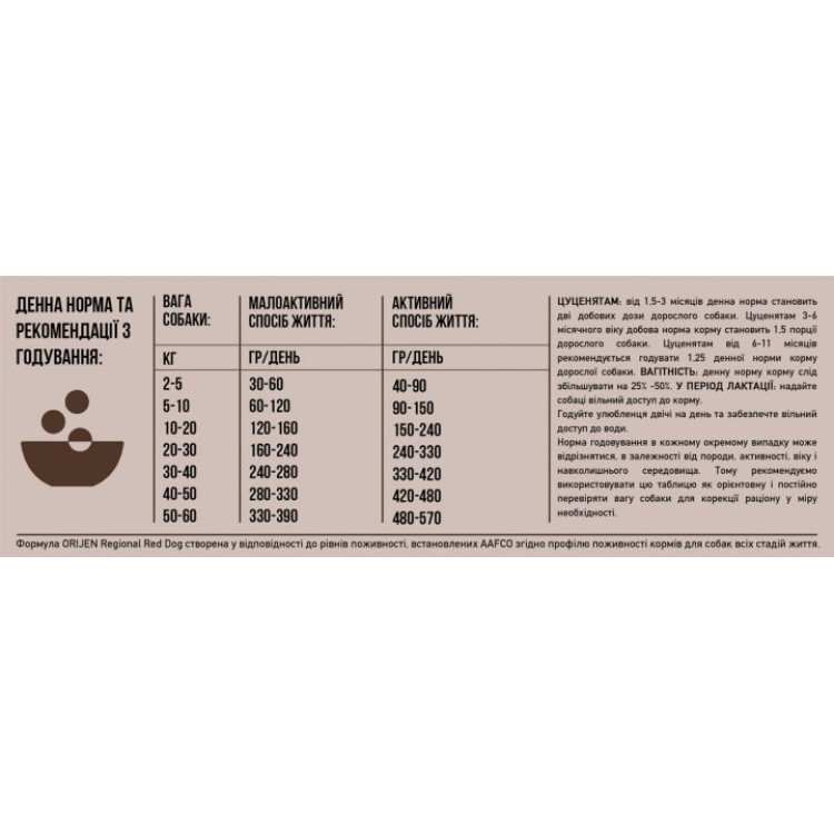Філософія Orijen полягає у створенні корму, найбільш наближеного до природної дієти собаки. Regional Red Dog не містить зернових інгредієнтів та зайвих заповнювачів, замість них у його складі присутні свіжі фрукти, овочі та трави, які багаті на вітаміни та мінерали.