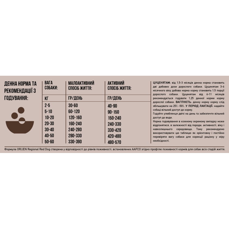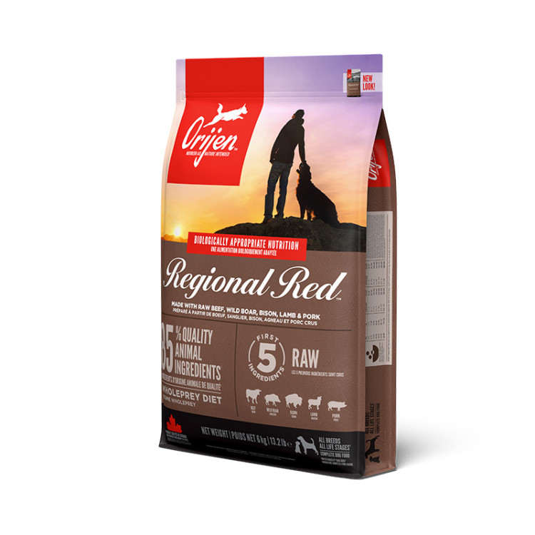 Філософія Orijen полягає у створенні корму, найбільш наближеного до природної дієти собаки. Regional Red Dog не містить зернових інгредієнтів та зайвих заповнювачів, замість них у його складі присутні свіжі фрукти, овочі та трави, які багаті на вітаміни та мінерали.