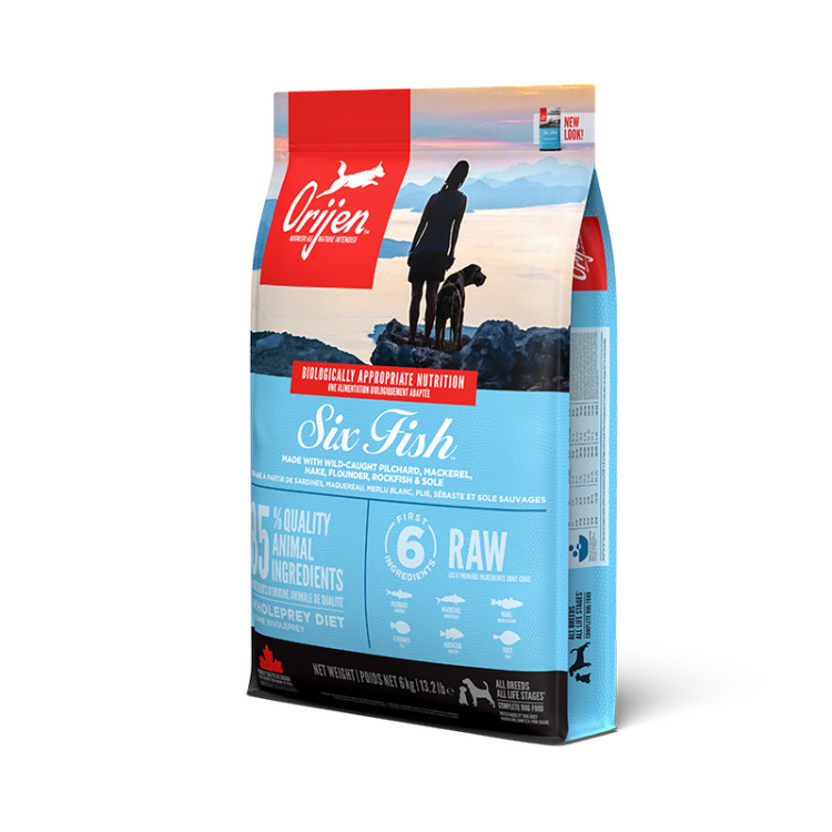 Orijen Six Fish Dog - це сухий корм для собак усіх порід та вікових груп, який надає вашому вихованцю унікальне та багате харчування, засноване на високоякісних та різноманітних видах риби.