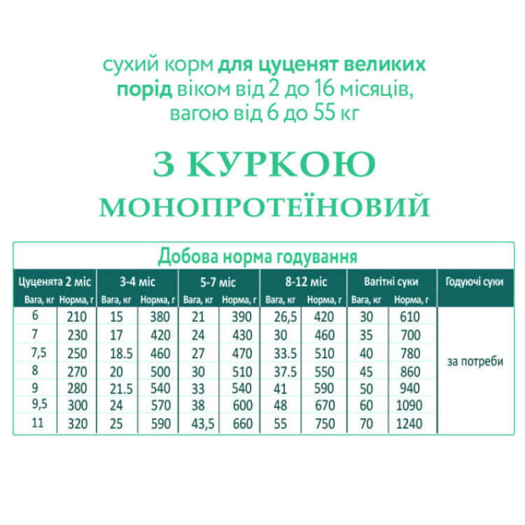 Цей корм забезпечує збалансований склад поживних речовин, який необхідний для оптимального розвитку та зростання цуценят великих порід. Високий вміст білка допомагає формуванню міцних м`язів та підтримці активності.