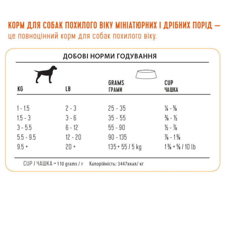 калорійність (3447 ккал/кг) повністю задовольняє всі потреби літніх або малоактивних собак міні та малих порід;