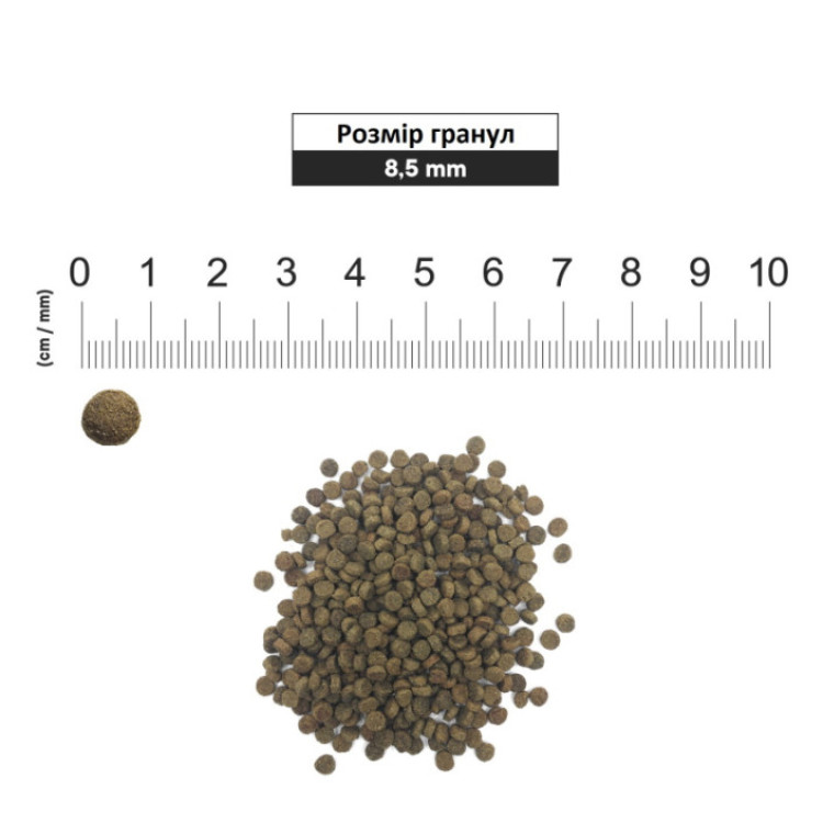АНАЛІЗ СКЛАДУ: протеїн – 25%, жир – 12%, клітковина – 4,5%, зола – 8%, вологість – 10%, кальцій – 1%, фосфор – 0,8%, натрій – 0,15%, глюкозамін – 760 мг/кг, хондроїтин – 550 мг/кг